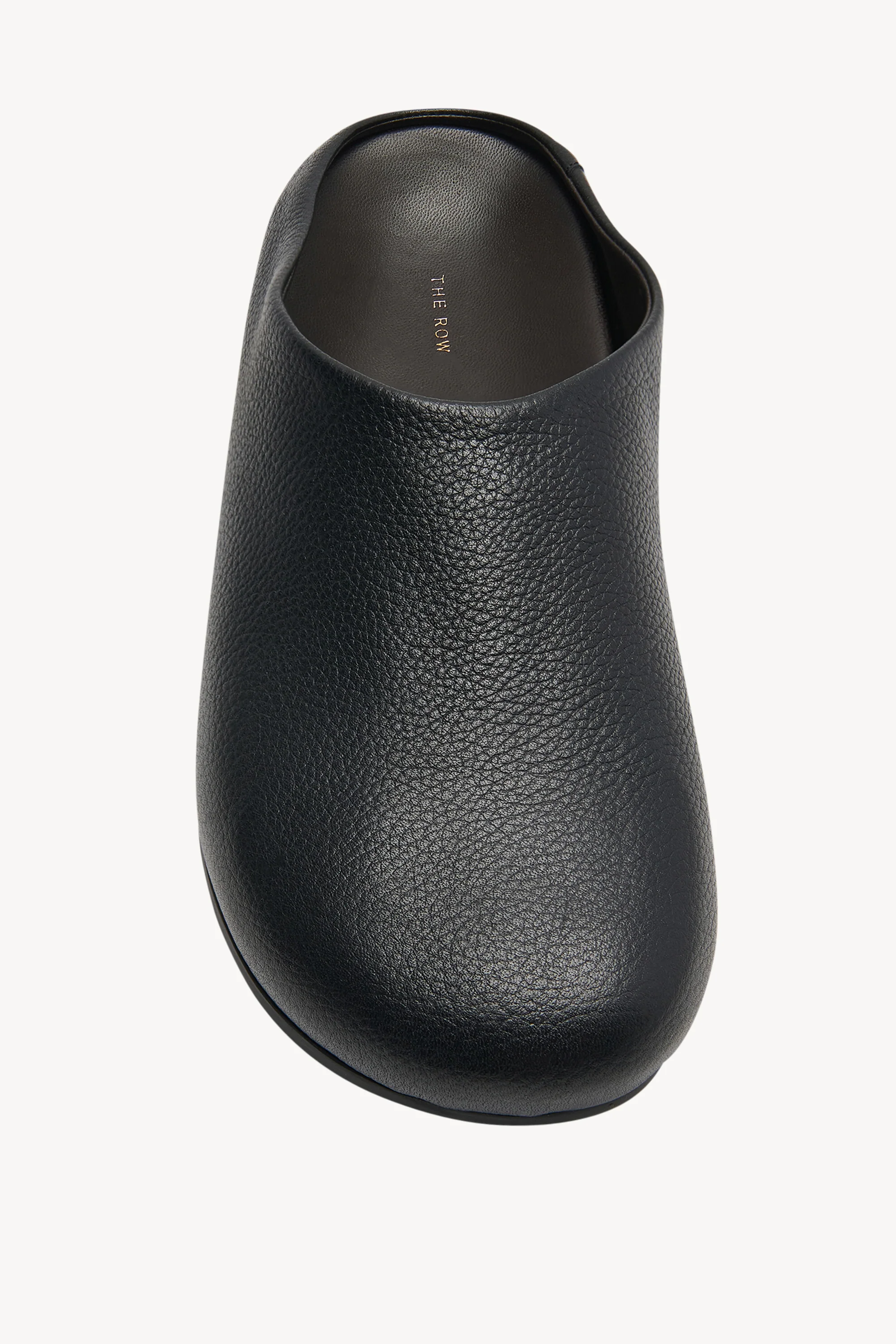 Relaxed slip-on shoe in grained calfskin leather and soft shearling with round toe, contoured footbed, and rubber sole.