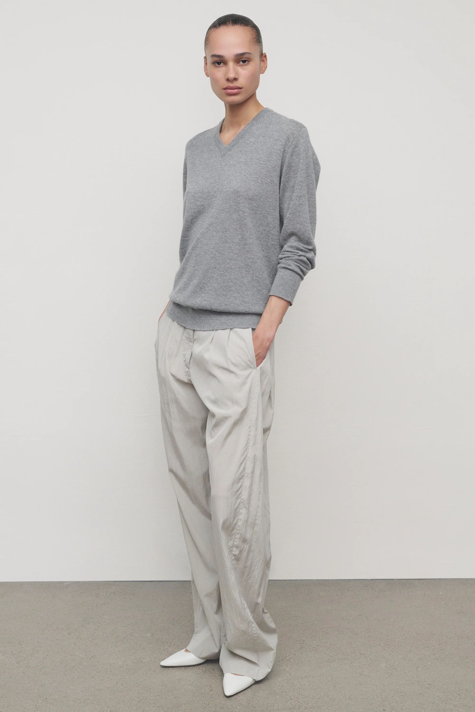 Tailored low-rise pant in softly crinkled technical silk with barrel leg, front double pleats, adjustable back button tabs, and side welt pockets.