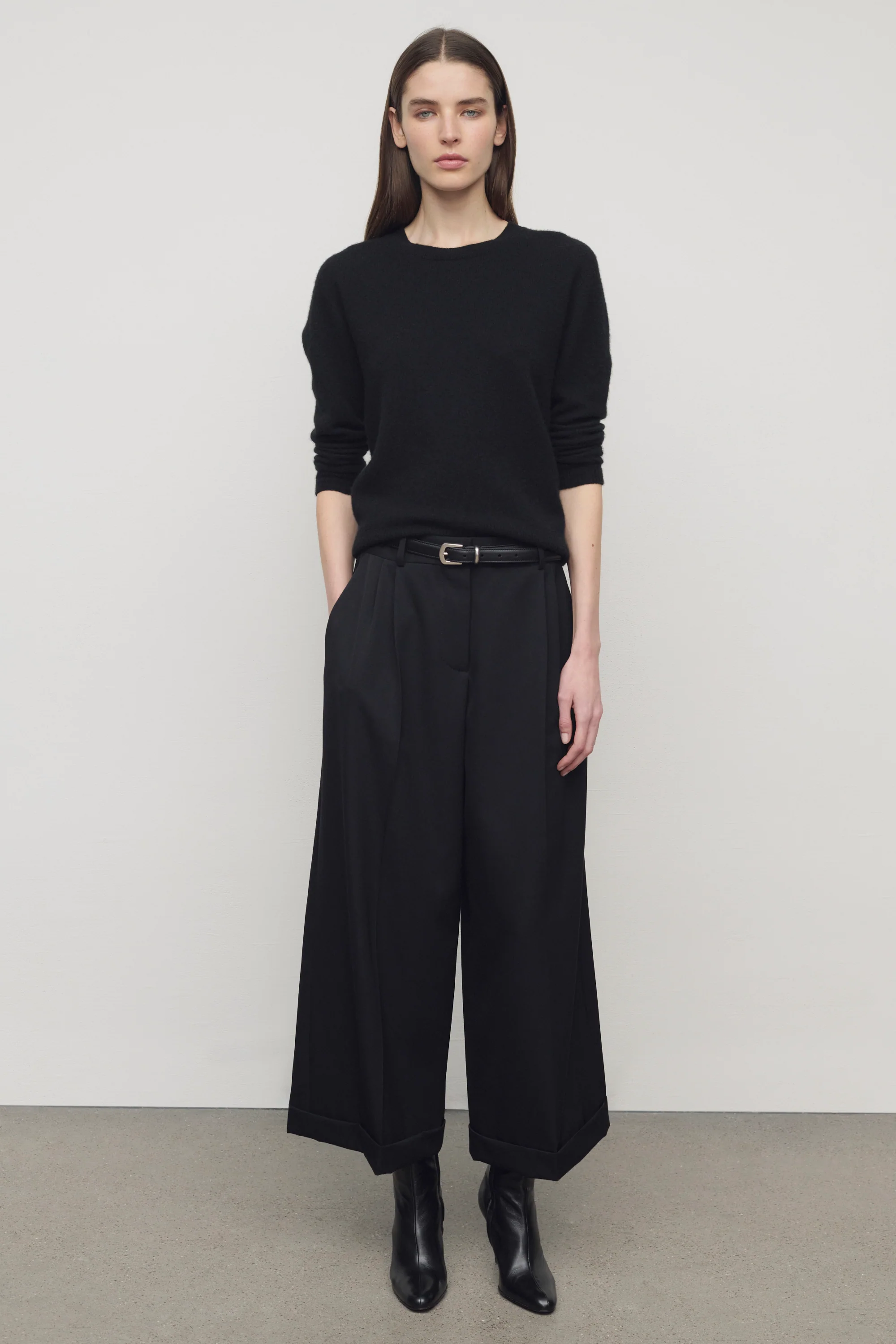 Tailored low-rise trouser in fluid Japanese wool gabardine with wide cuffed leg, front double pleats, and side slash pockets.