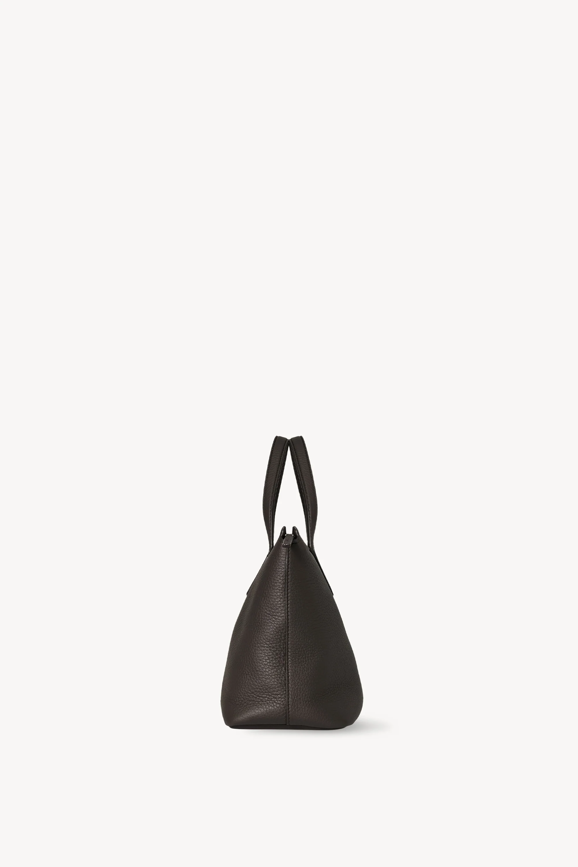 Top handle bag in textured calfskin leather with flat handles, overlap construction, and concealed top zipper closure. The softly structured silhouette is lined in smooth nappa with a folded top edge for a refined finish. Minimally finished, the natural grain surface is left intact, giving the leather a supple hand and refined texture that develops character over time.