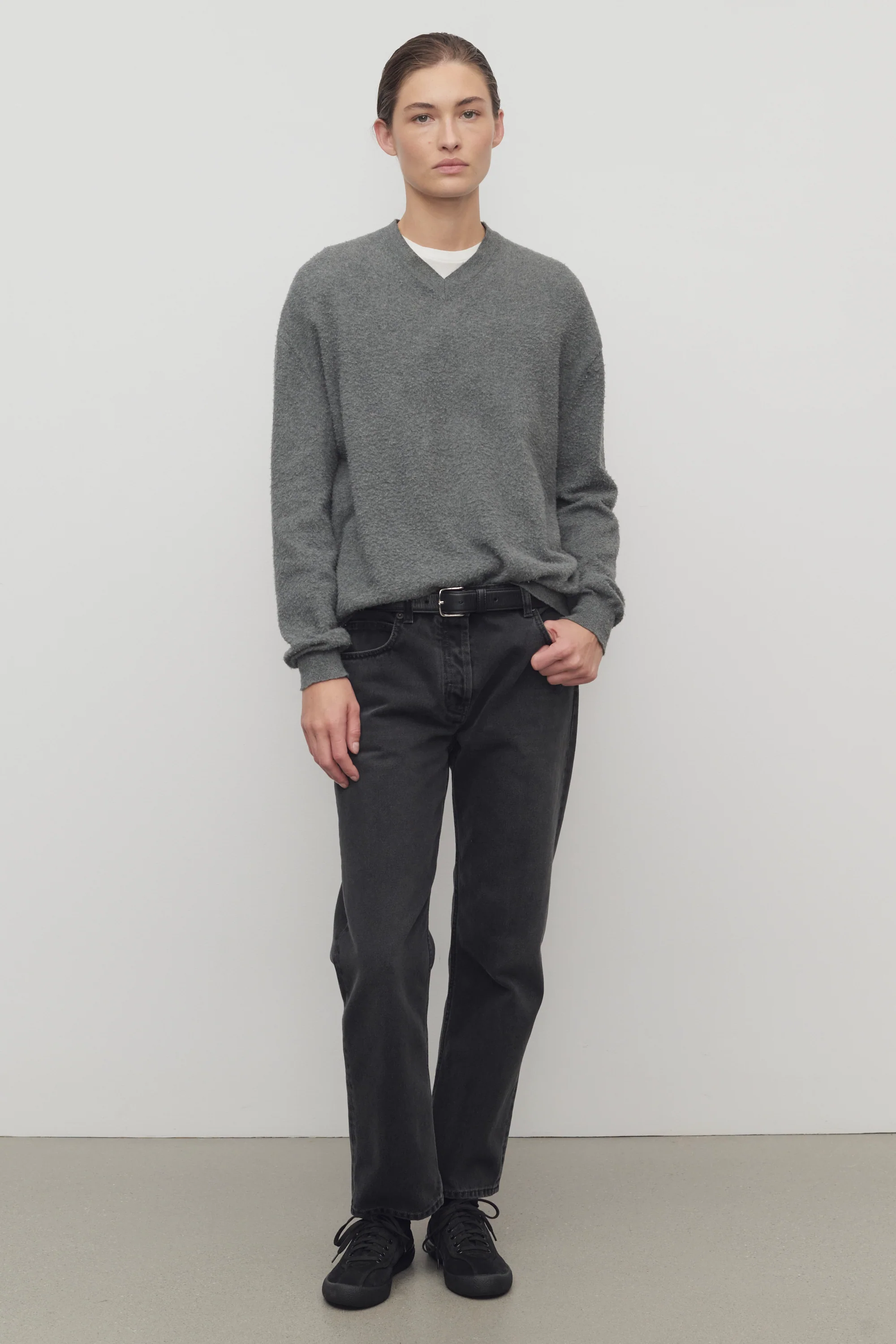 Mid-rise jean in in gently faded cotton denim with slim leg, tonal topstitching, and classic 5-pocket construction.
